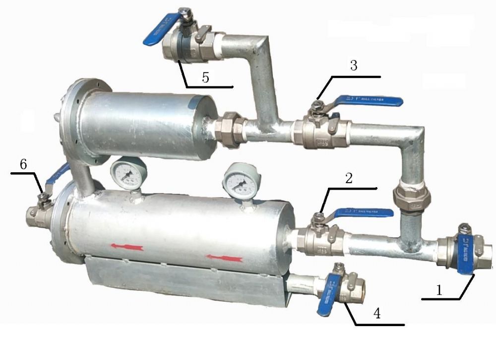IV、 副過濾器反沖洗過濾:依次打開1、2號進(jìn)水口閥門、5號副過濾器排污閥門;依次關(guān)閉3號反沖洗閥門、6號出水口閥門、4號主過濾器排污閥門,水由進(jìn)水口閥門進(jìn)入主過濾器過濾,反方向進(jìn)入副過濾器對濾芯進(jìn)行反沖洗,污水由副過濾器排污閥門排出;副過濾器反沖洗完成。