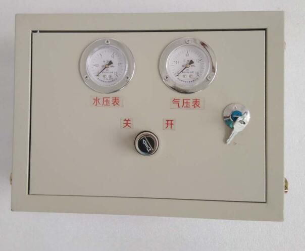 ZPFS氣控式風(fēng)水聯(lián)動(dòng)噴霧降塵裝置控制箱(以下簡(jiǎn)稱控制箱)采用內(nèi)置風(fēng)、水控制閥對(duì)裝置用風(fēng)、水壓力進(jìn)行調(diào)控,對(duì)風(fēng)水比例進(jìn)行均衡,采用氣控閥(控制箱圖片上的“開關(guān)”)控制噴霧裝置的開啟與關(guān)閉??刂葡溟T扇上鑲嵌氣控閥(開關(guān)旋鈕)控制噴霧裝置的開啟與關(guān)閉,鑲嵌有水壓表、氣壓表,分別顯示調(diào)控后的水、氣壓力。